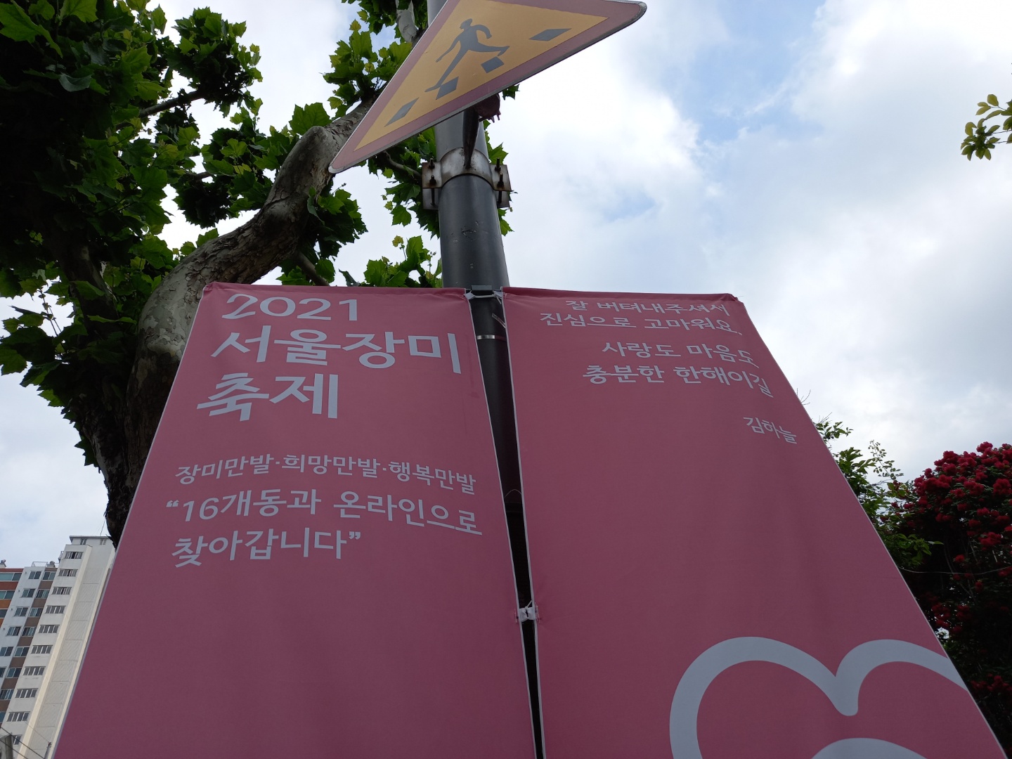 입구에 서울축제장미 일정을 알려주는 플랜카드 보이네요.