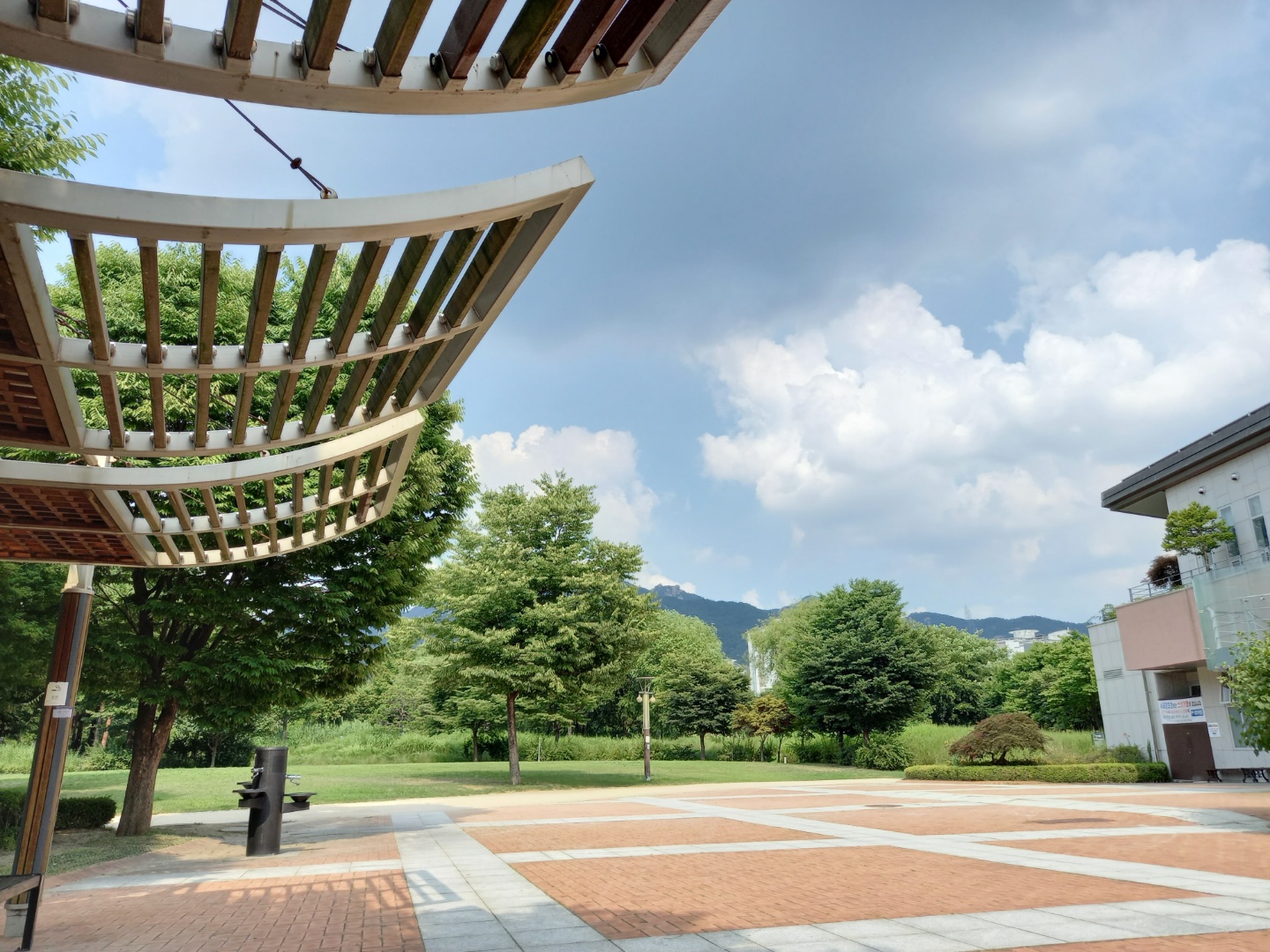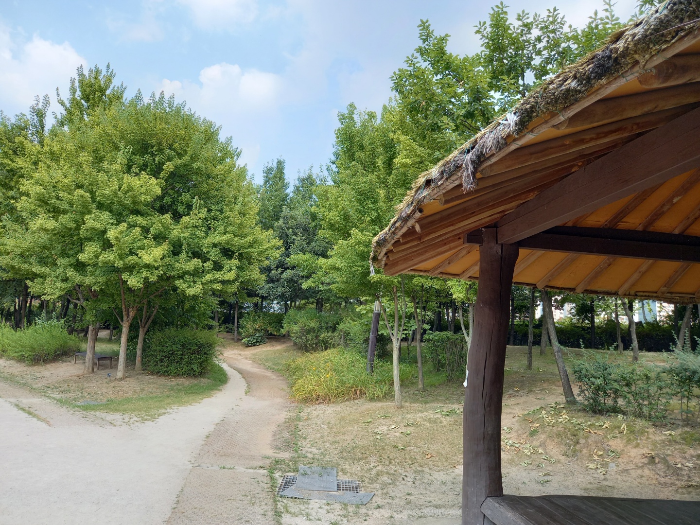 예쁜 정자의 모습과 나무와 파란 하늘이