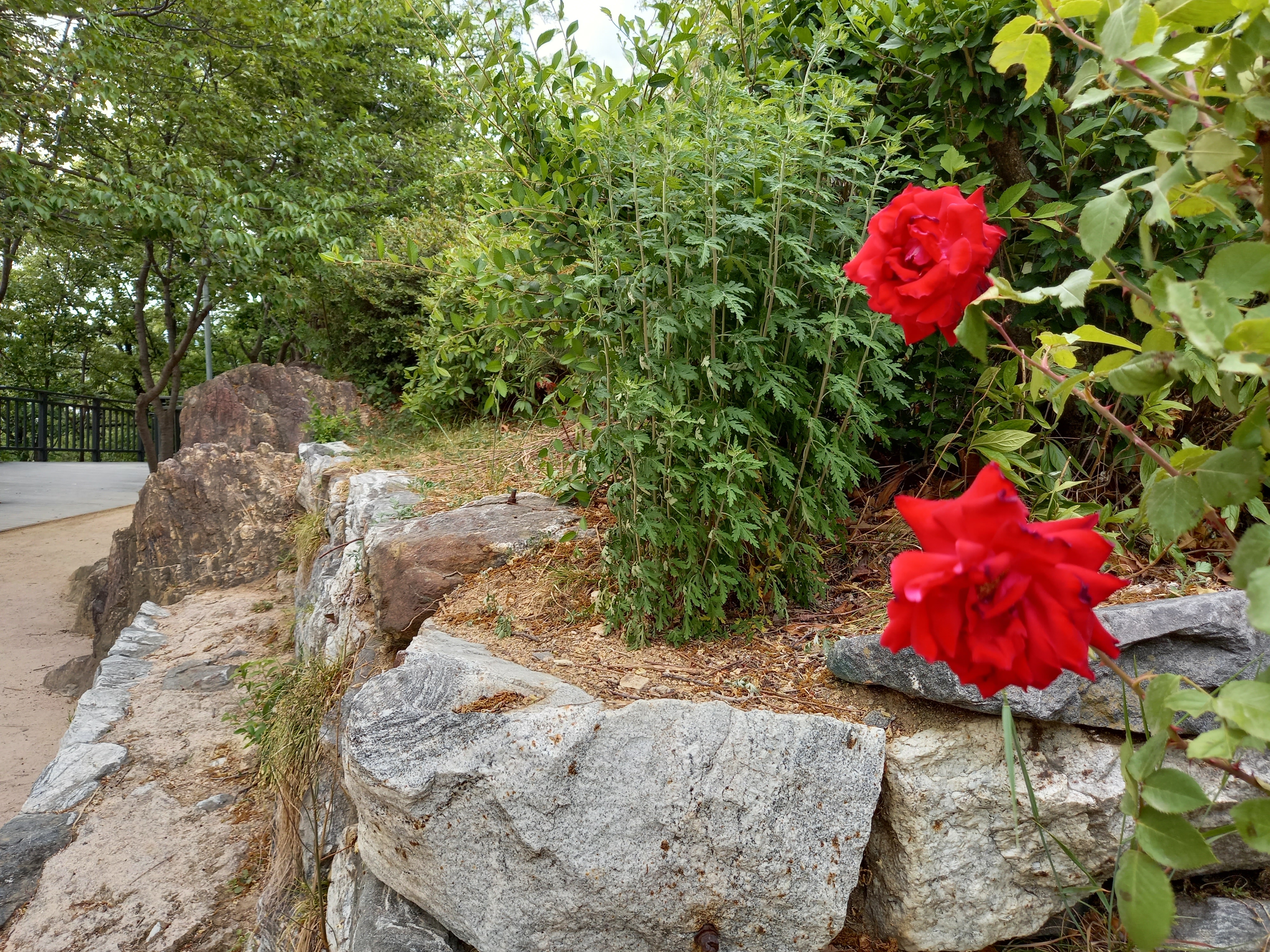 봉수대 옆에서 살포시 붉은 장미꽃이 피어 있네요.