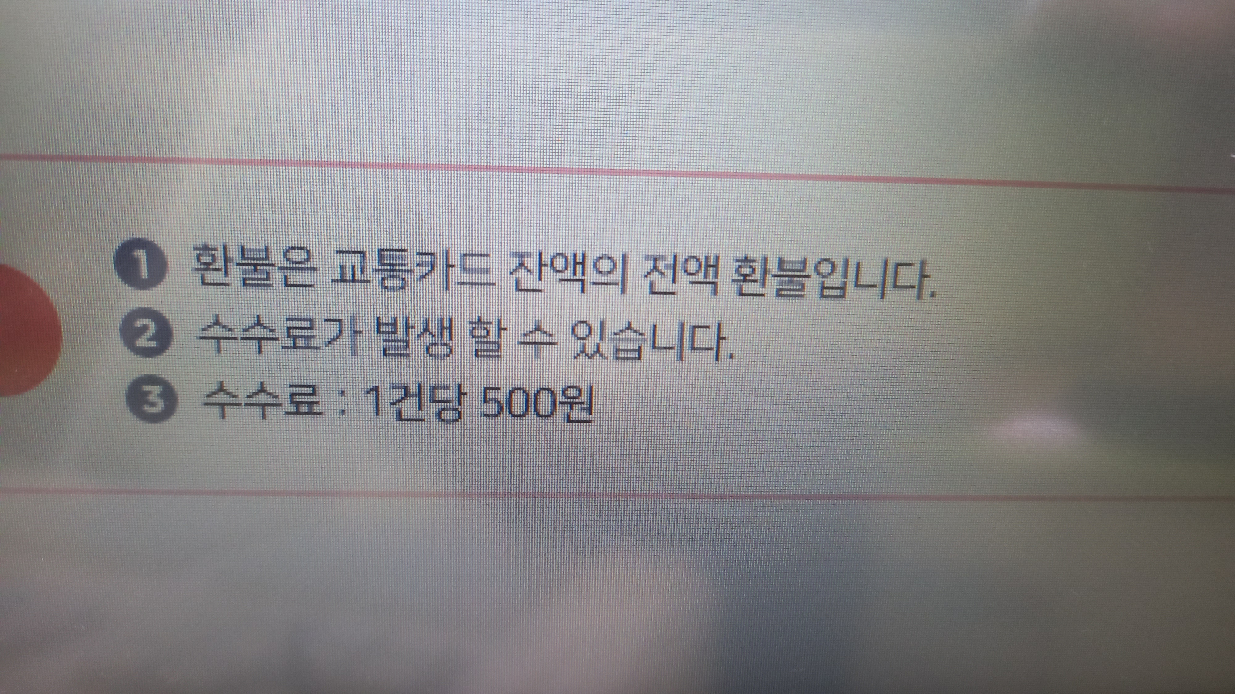 (8) 예를 들어 교통카드 30,000원 잔액. 환불 진행후 환불 수수료 500원 차감후 29,500원 손님에게 전달.