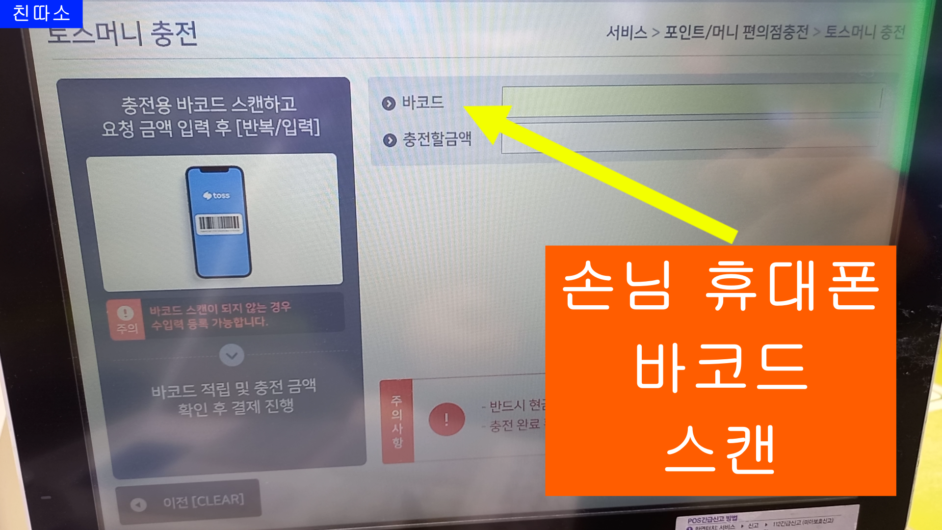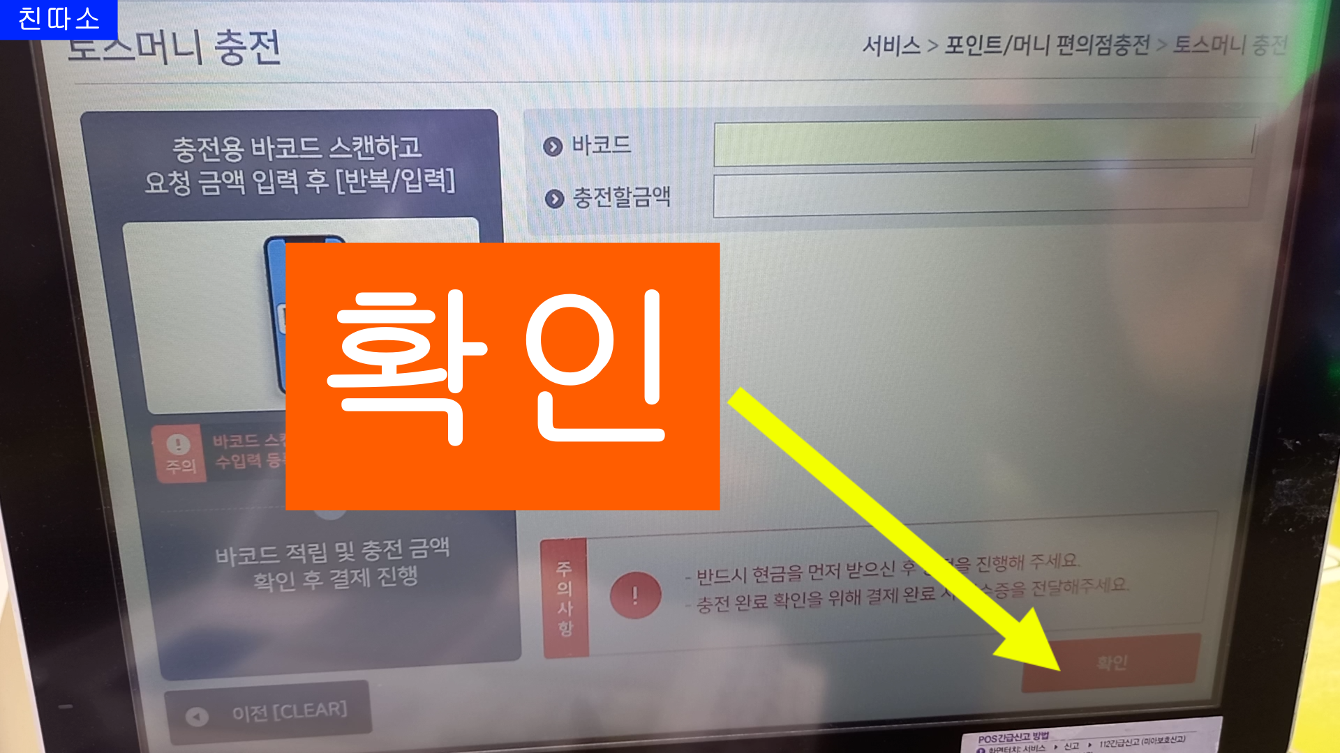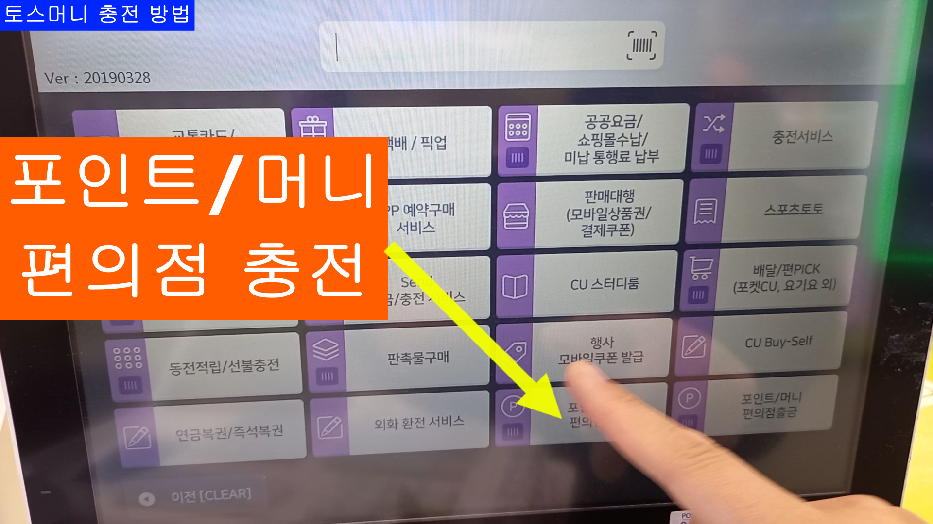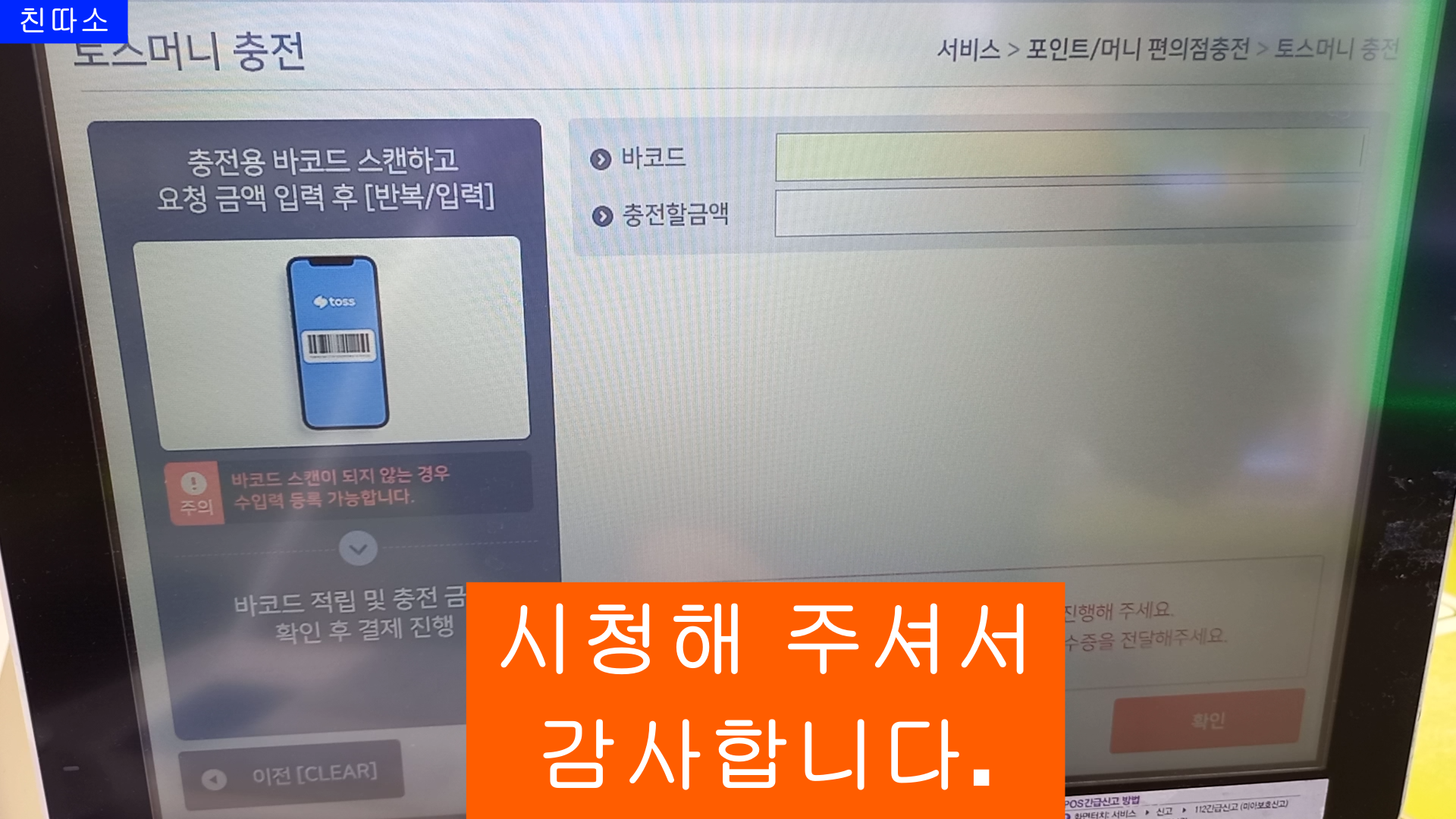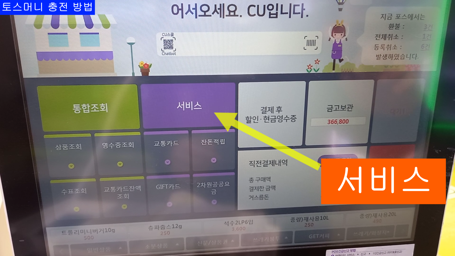 이번 블로그는 CU편의점 POS사용법 중에 "토스머니 충전" 방법 입니다.