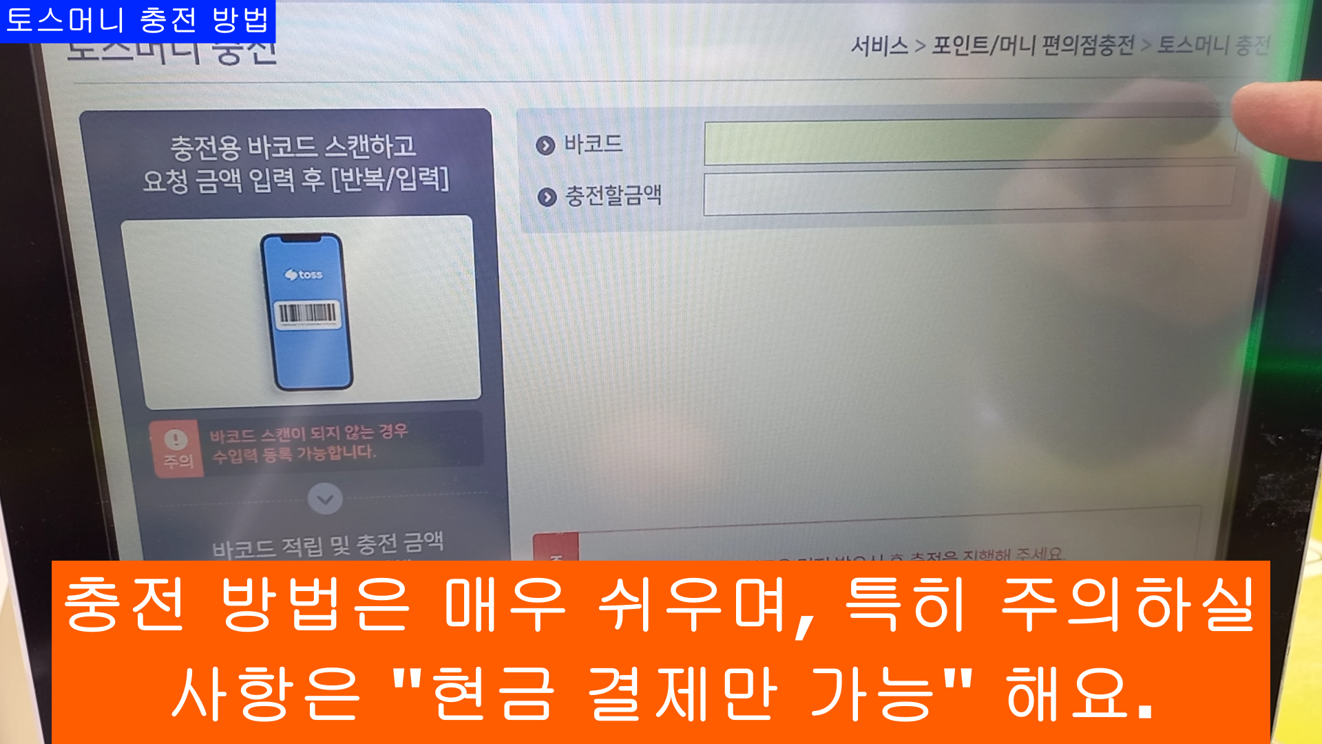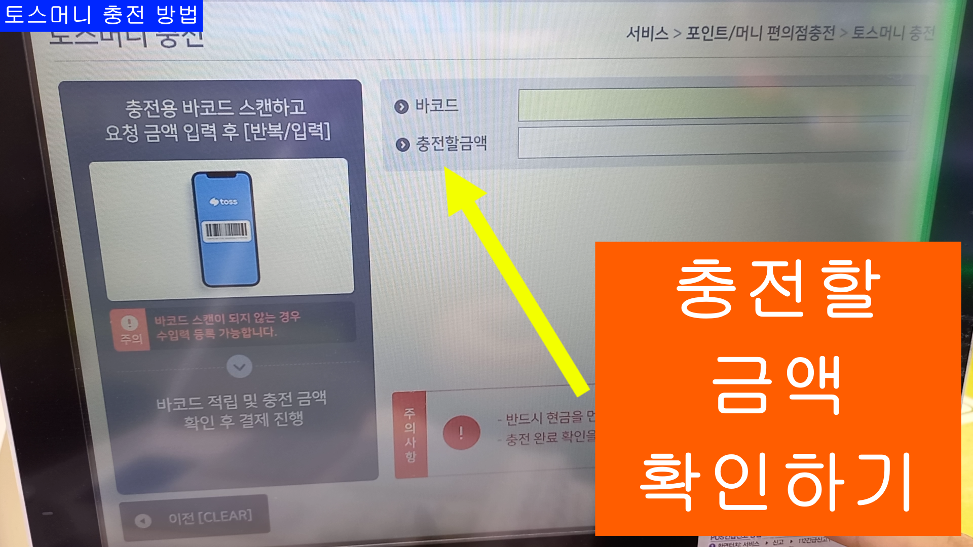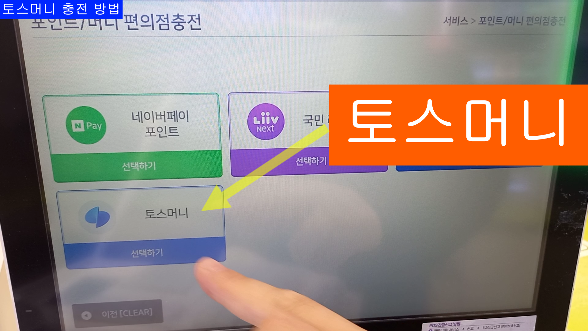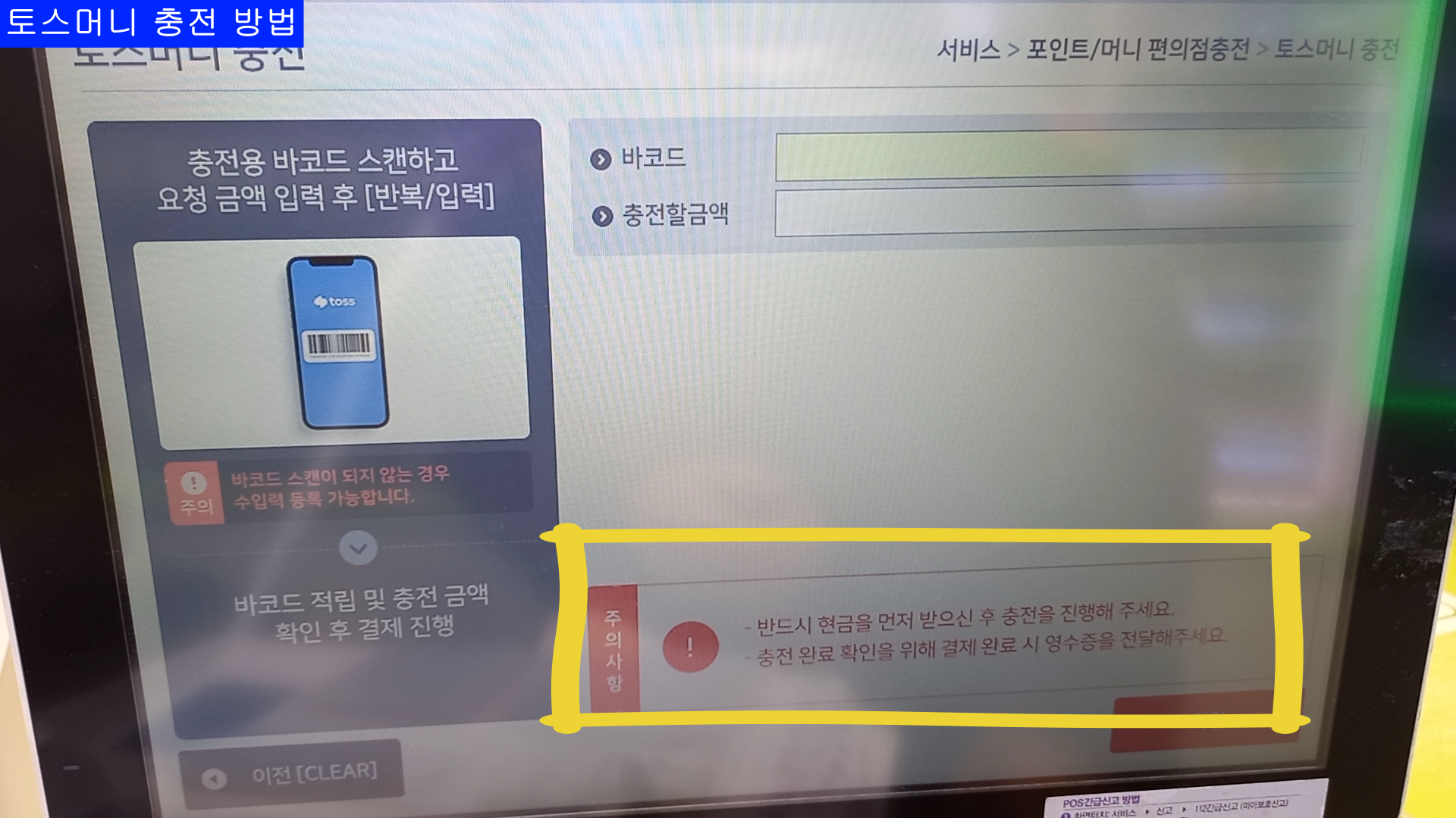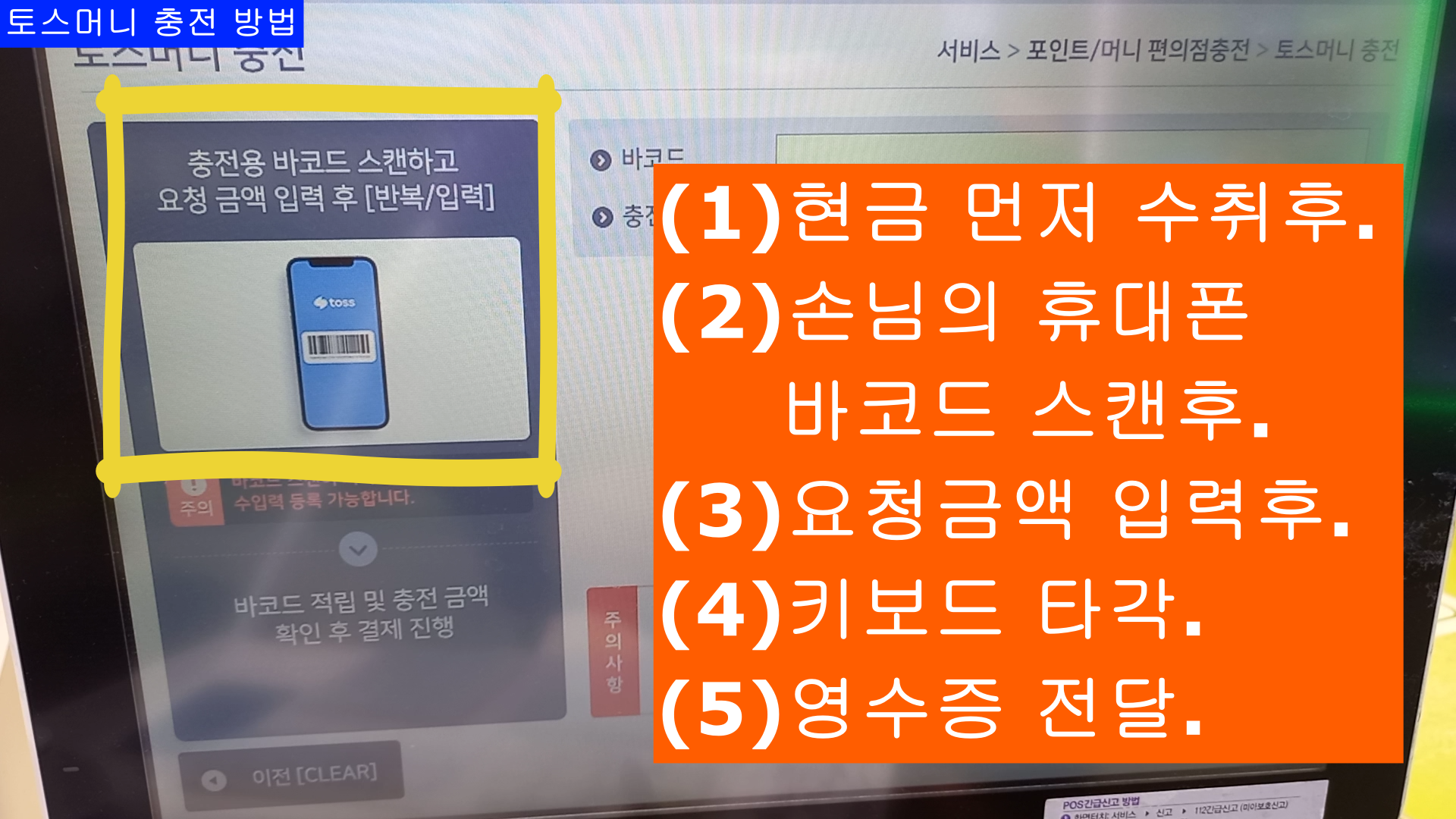 이번 블로그는 CU편의점 POS사용법 중에 "토스머니 충전" 방법 입니다.